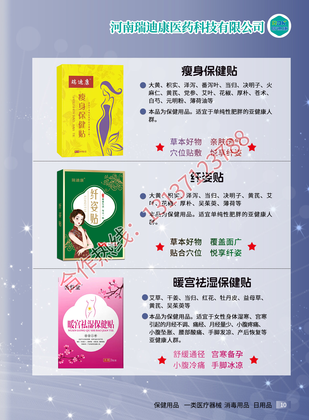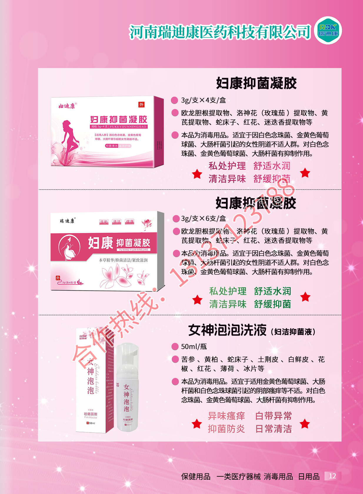 婦科產(chǎn)品,呵護(hù)女性。瑞迪康婦科健康產(chǎn)品生產(chǎn)廠家,產(chǎn)品有婦康抑菌凝膠、女神泡泡抑菌液、乳腺貼穴位壓力刺激貼、乳腺通絡(luò)保健貼等婦科健康產(chǎn)品。源頭廠家,資質(zhì)齊全,支持一件代發(fā),貼牌定制,來樣加工。適用多種渠道:實(shí)體店、線上線下、電商直播、社群。合作熱線:13137123788...