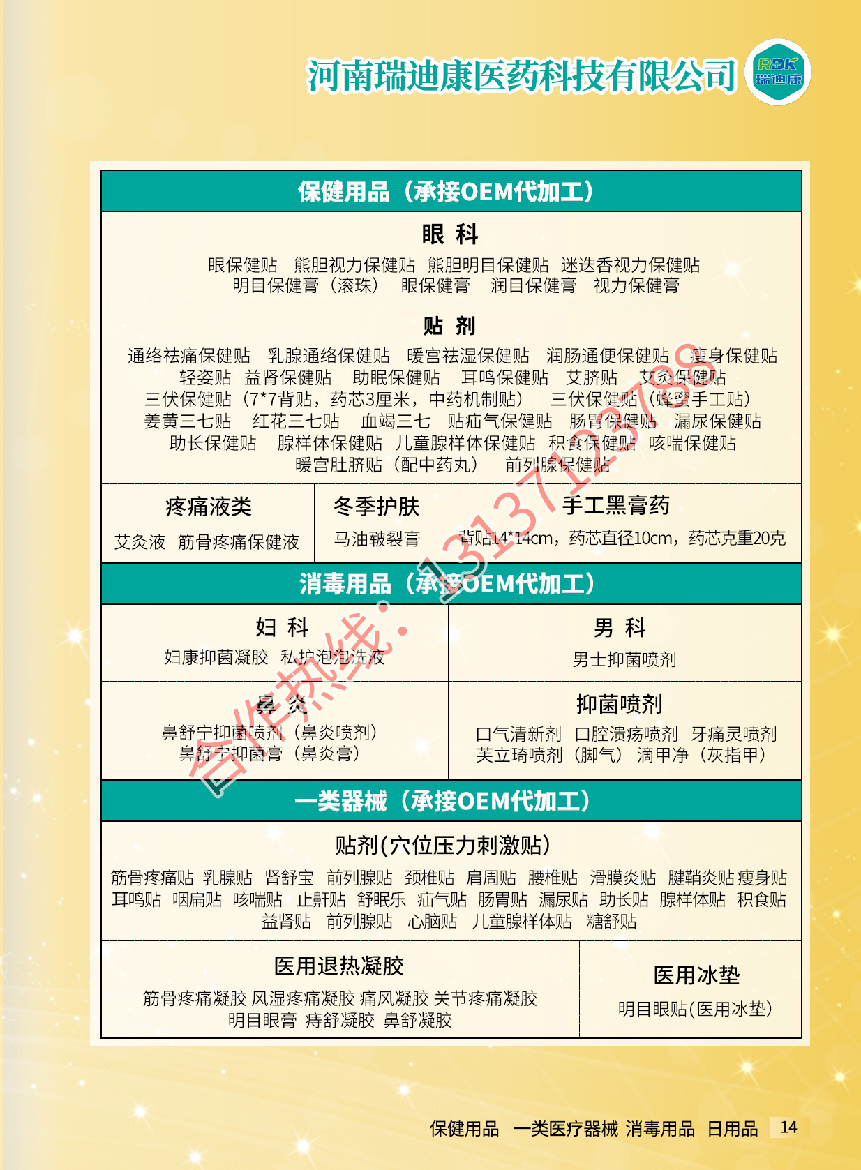 河南瑞迪康醫(yī)藥科技有限公司主要經(jīng)營一類器械、衛(wèi)消證字號(hào)產(chǎn)品OEM、抑菌制劑OEM(液體、膏體、黑膏貼劑、凝膠)、健證字號(hào)產(chǎn)品OEM、保健用品OEM(粉劑、黑膏貼劑、膏劑、片劑、凝膠)。主要加工模式:OEM貼牌加工、ODM加工、委托加工、貼牌加工。咨詢電話:13137123788